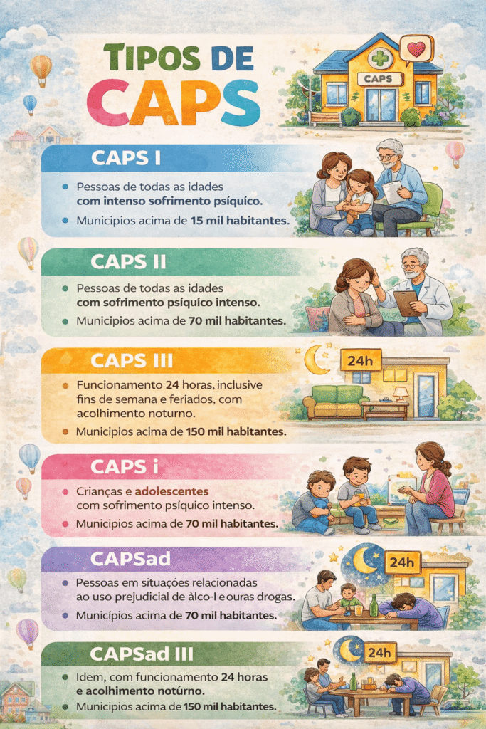 - CAPS I — Pessoas de todas as idades com intenso sofrimento psíquico. Municípios acima de 15 mil habitantes.
